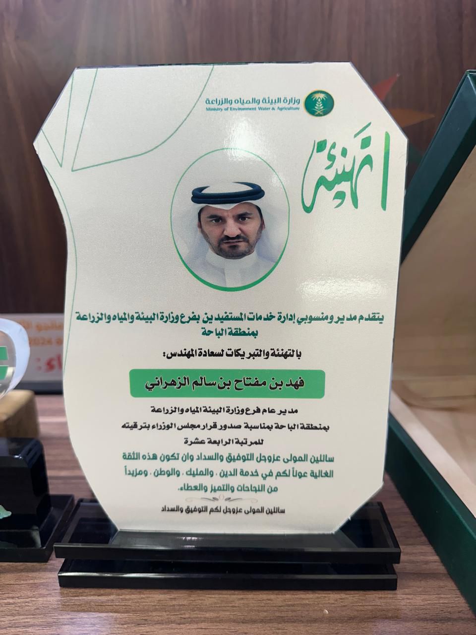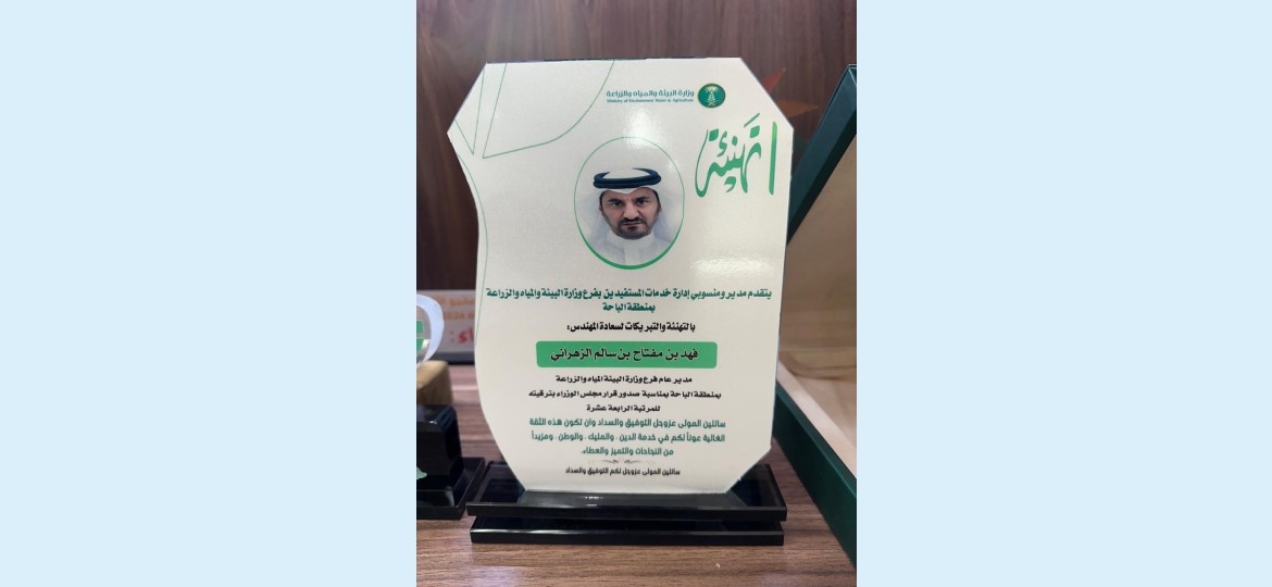 قدم مدير ومنسوبي إدارة خدمات المستفيدين بفرع وزارة البيئة والمياه والزراعة منطقة الباحة الأستاذ علي بن فيصل الزهراني بأسمه ونيابة عن منسوبي الفرع التهنئة والتبريكات لسعادة المهندس فهد بن مفتاح بن سالم الزهراني مدير عام فرع وزارة البيئة المياه والزراعة بمنطقة الباحة بمناسبة صدور قرار مجلس الوزراء بترقيته للمرتبة الرابعة عشرة .