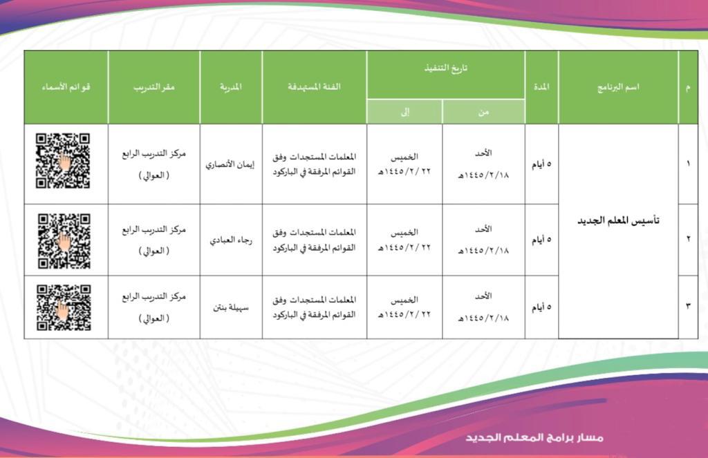 أطلقت الإدارة العامة للتعليم بمنطقة مكة المكرمة ممثلةً في إدارة التدريب والابتعاث من يوم الأحد 18/2 /1445هـ وحتى 29/2/1445هـ ، خطة مسار المعلم الجديد للعام الدراسي 1445هـ وذلك بواقع 11 برنامج تدريبي، 9 منها حضوريا في قاعات تدريبية مجهزة بشكل متكامل بكل الوسائل والأدوات الخاصة بالتدريب ، و2 منها عن بعد وفق أفضل الممارسات التدريبية الإلكترونية الحديثة ؛ وذلك انطلاقًا من حرص الإدارة العامة بتعليم مكة المكرمة على الإسهام في تحقيق الجهود المتواصلة التي تبذلها وزارة التعليم بالمملكة العربية السعودية من أجل تحقيق مستهدفات المملكة لرؤية سنة 2030، واستغلال الموارد البشرية بشكل أفضل والعمل على إيجاد البرامج المهنية التي تساهم في تحضير المعلم الجديد وتعريفه بكل الأنظمة واللوائح والمسؤوليات المتعلقة بالعمل وأخلاقيات المهنية ومختلف البيئات التعليمية.
