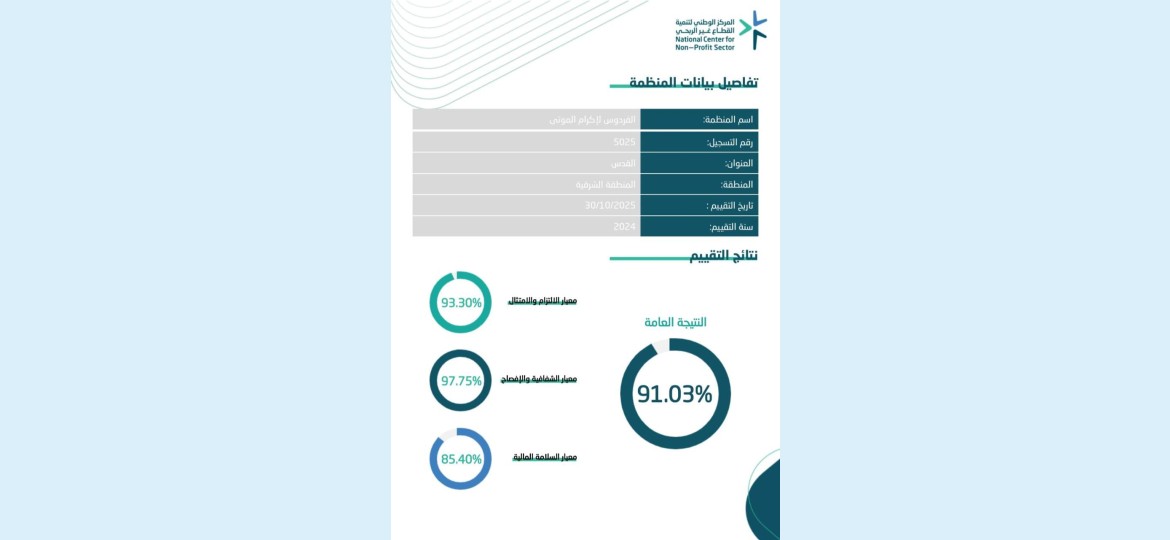 حققت جمعية ”الفردوس لإكرام الموتى“ في المنطقة الشرقية إنجازاً إدارياً نوعياً بحصولها على نسبة 91,03% في الدرجة العامة لتقييم الحوكمة لعام 2024، وفقاً للتقرير الصادر عن المركز الوطني لتنمية القطاع غير الربحي.
