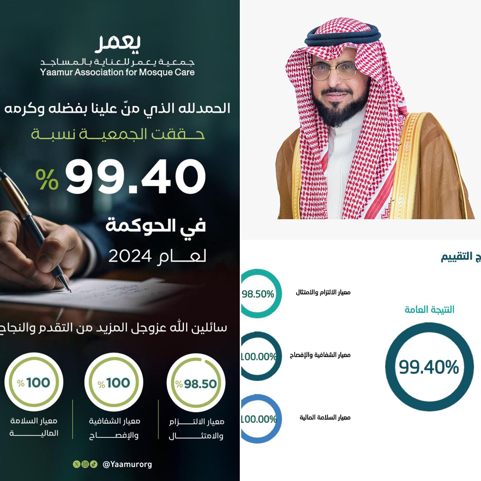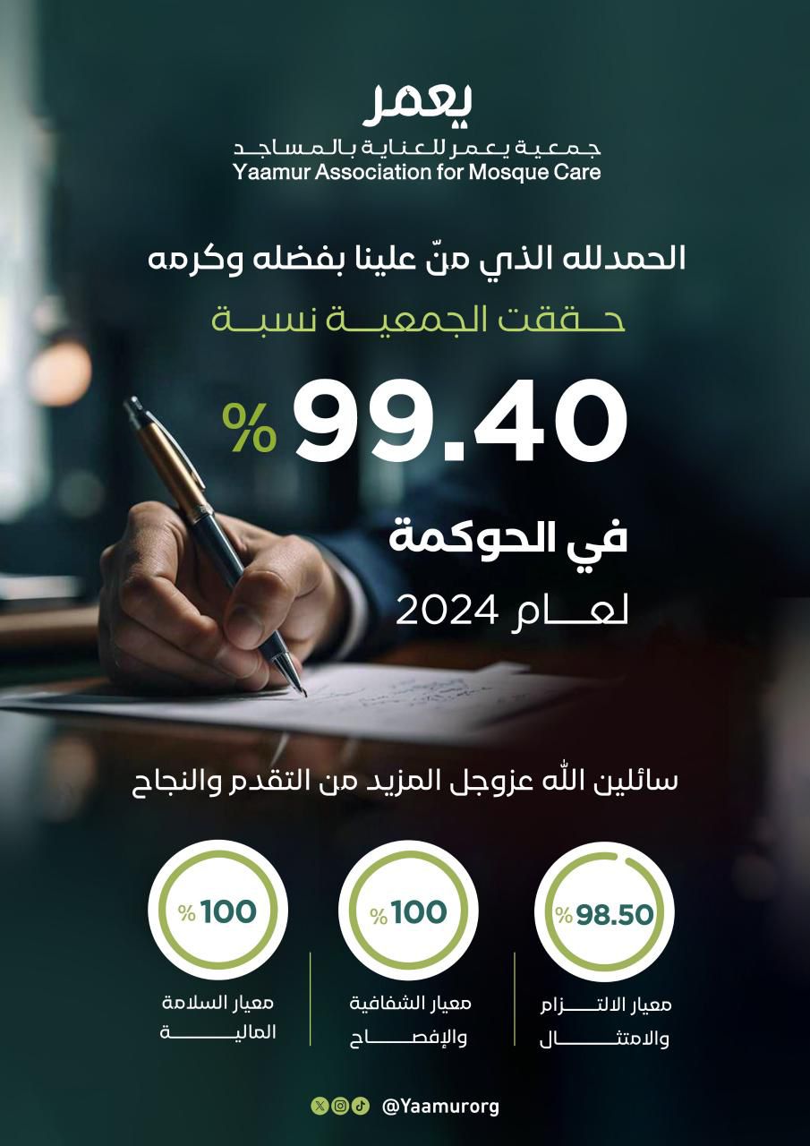 حققت جمعية يعمر للعناية بالمساجد نتيجة 99.40% في التقييم الشامل لمعايير الحوكمة لسنة التقييم 2024، والذي يشمل معايير الالتزام والامتثال والشفافية والإفصاح والسلامة المالية, ويأتي هذا الإنجاز ليضع الجمعية ضمن أعلى الجهات المستوفية لمتطلبات الحوكمة على مستوى القطاع غير الربحي.