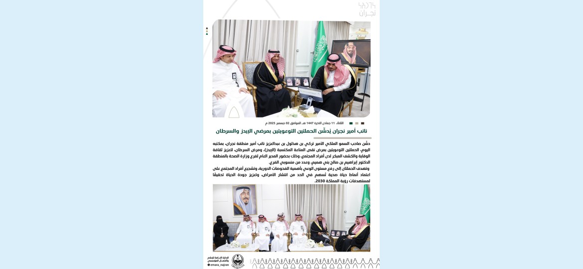 دشّن صاحب السمو الملكي الأمير تركي بن هذلول بن عبدالعزيز نائب أمير منطقة نجران، بمكتبه اليوم، الحملتين التوعويتين بمرض نقص المناعة المكتسبة (الإيدز)، ومرض السرطان، لتعزيز ثقافة الوقاية والكشف المبكر لدى أفراد المجتمع، وذلك بحضور المدير العام لفرع وزارة الصحة بالمنطقة الدكتور إبراهيم بن صالح بني هميم، وعدد من منسوبي الفرع.