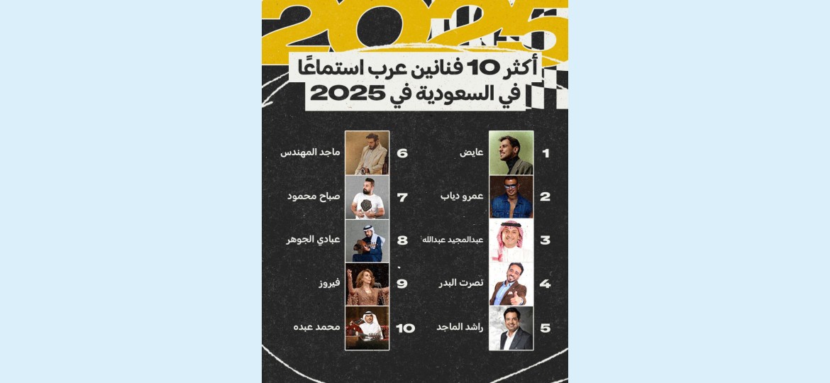 أما بقية قائمة العشرة الأوائل فتضم عمالقة الفن العربي، من بينهم فيروز، ماجد المهندس، عبادي الجوهر، ومحمد عبده. كذلك، جاء صباح محمود ضمن العشرة الأوائل، مستفيداً من حضوره القوي في قائمة الأغاني العربية الأكثر استماعاً إليها في السعودية لهذا العام.
