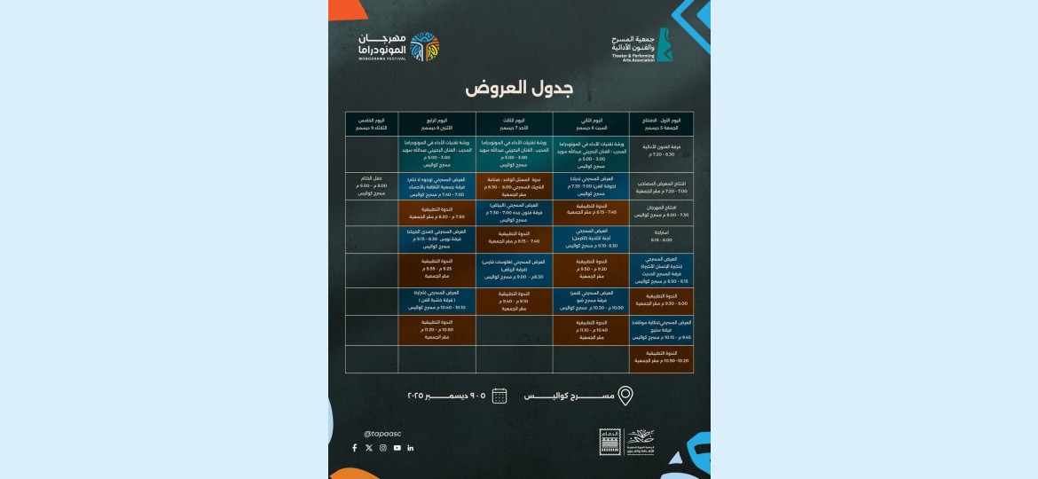 يُنظم المهرجان في مسرح كواليس بالدمام، مستمراً إلى يوم الثلاثاء المقبل ٩ ديسمبر، شاملاً برنامجاً متكاملاً يجمع بين العروض المسرحية المكثفة، والورش التدريبية المتخصصة، والندوات النقدية التي تثري المشهد الثقافي، مستهدفاً الجمهور العام، والمهتمين، والممارسين، والنقاد في المجال المسرحي، بالإضافة إلى الصحافيين.