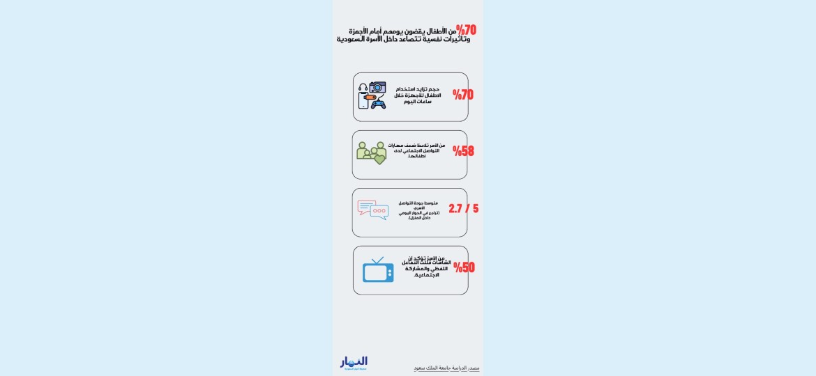 وتدعو هذه المؤشرات، وفق خبراء تربويين ونفسيين، إلى تعزيز الوعي الأسري وإطلاق برامج وطنية تستهدف توجيه الاستخدام الرقمي بصورة صحية، بما يحقق التوازن بين الحياة الرقمية والواقع الاجتماعي، ويحمي الأجيال الناشئة من المخاطر النفسية المترتبة على التعرض طويل الأمد للشاشات.