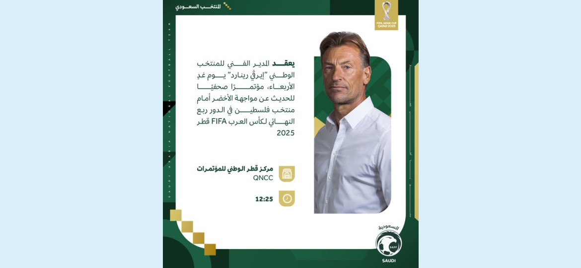 يعقد المدير الفني للمنتخب الوطني إيرڤي رينارد عند الساعة 12:25 من مساء يوم غدٍ الأربعاء مؤتمرًا صحفيًا في مركز قطر الوطني للمؤتمرات، للحديث عن مواجهة الأخضر أمام منتخب فلسطين في الدور ربع النهائي من كأس العرب FIFA قطر 2025™️.