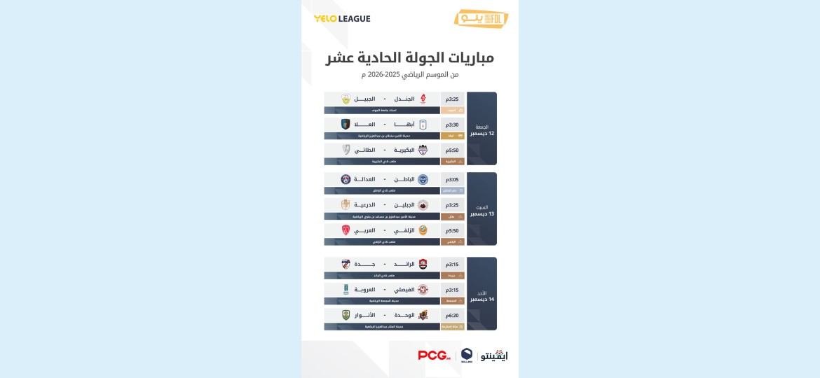 وتُختتم الجولة الأحد بثلاث مباريات بارزة، إذ يلتقي الرائد السادس (18 نقطة) مع جدة التاسع (15 نقطة)، فيما يستقبل الفيصلي الثامن (15 نقطة مع مباراة مؤجلة) فريق العروبة ثالث الترتيب (22 نقطة)، في مباراة قد تمنح العروبة فرصة خطف الصدارة بشرط تعثر أبها والعلا.