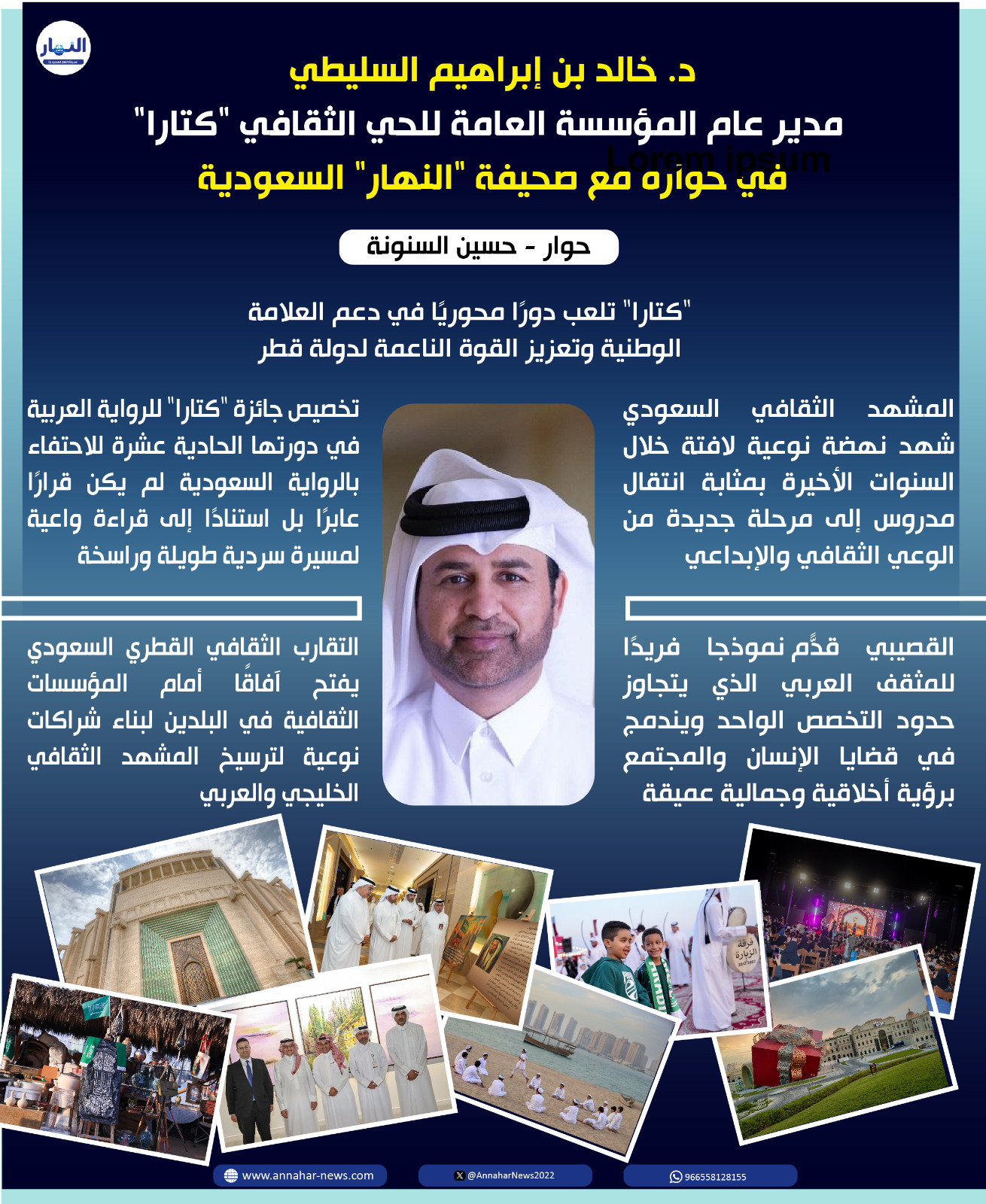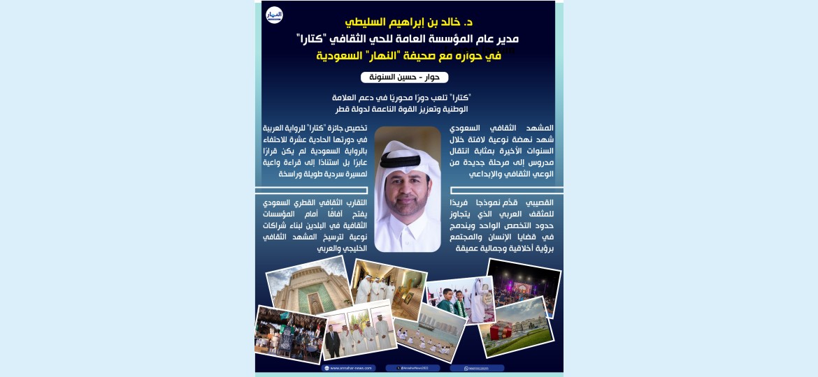 يؤكد د. خالد بن إبراهيم السليطي مدير عام المؤسسة العامة للحي الثقافي كتارا في دولة قطر لـ"صحيفة النهار السعودية" ان المشهد الثقافي السعودي خلال السنوات الأخيرة نهضة نوعية لافتة، يمكن وصفها بأنها انتقال مدروس إلى مرحلة جديدة من الوعي الثقافي والإبداعي. فقد استطاعت المملكة، عبر رؤية واعية ومؤسسات ثقافية فاعلة، أن تبني بيئة ثقافية متكاملة تُشجع على الإنتاج المعرفي، وتحتضن المبدعين، وتُعيد الاعتبار لصناعة الكتاب والرواية بوصفهما ركيزتين أساسيتين في بناء الوعي المجتمعي.