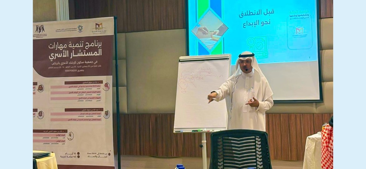 في إطار رسالتها الهادفة لبناء أسرة متوازنة ومجتمع أكثر استقرارًا، *دشّنت جمعية سكون للإرشاد الأسري اليوم برنامجها النوعي «تنمية مهارات المستشار الأسري»*، بالشراكة مع مركز بيت الخبرة، والذي يُعد إحدى المبادرات التدريبية المتخصصة الرامية إلى تأهيل وتمكين الكوادر العاملة في مجال الإرشاد الأسري، وفق منهجية علمية ومهنية متقدمة.