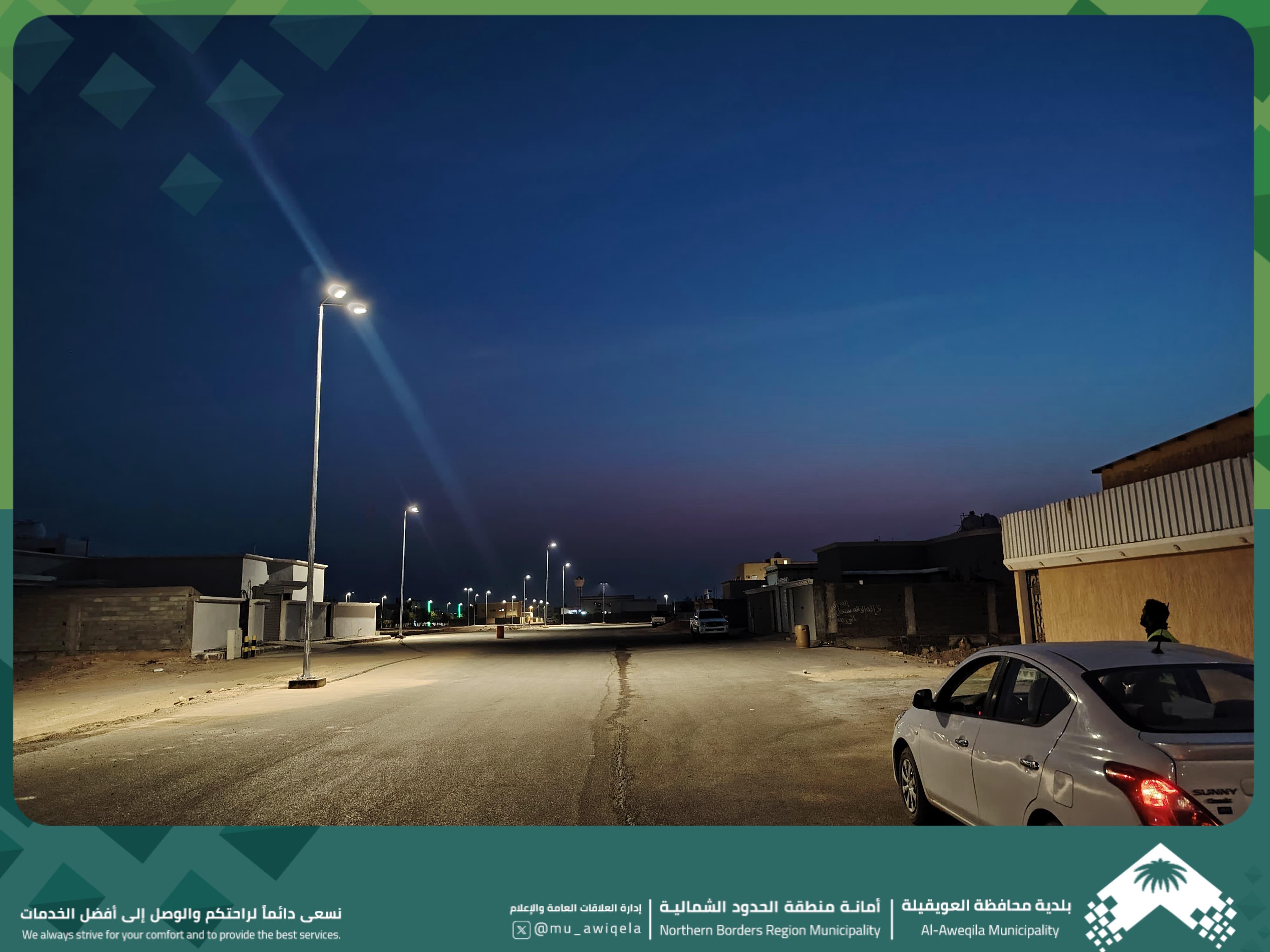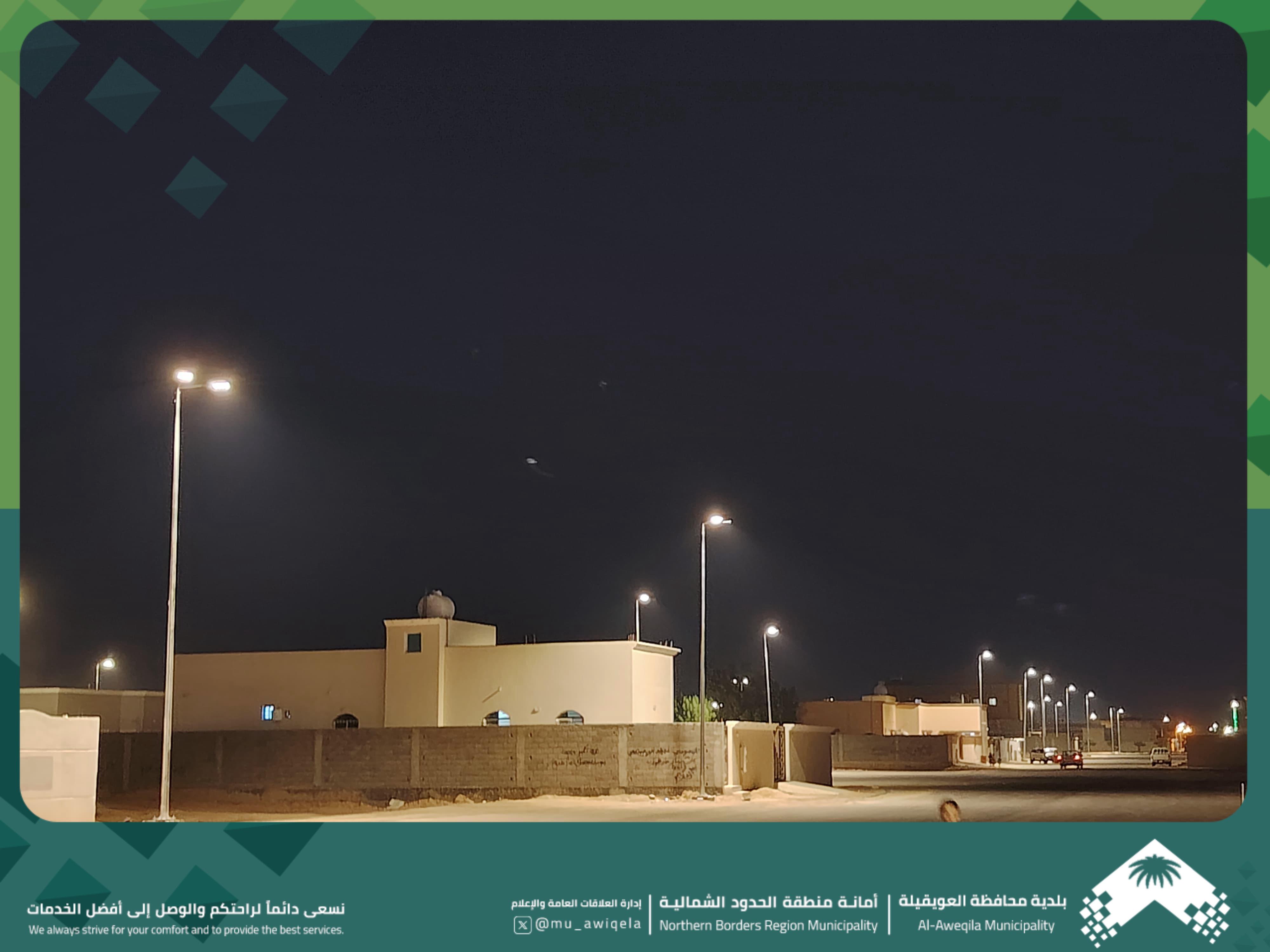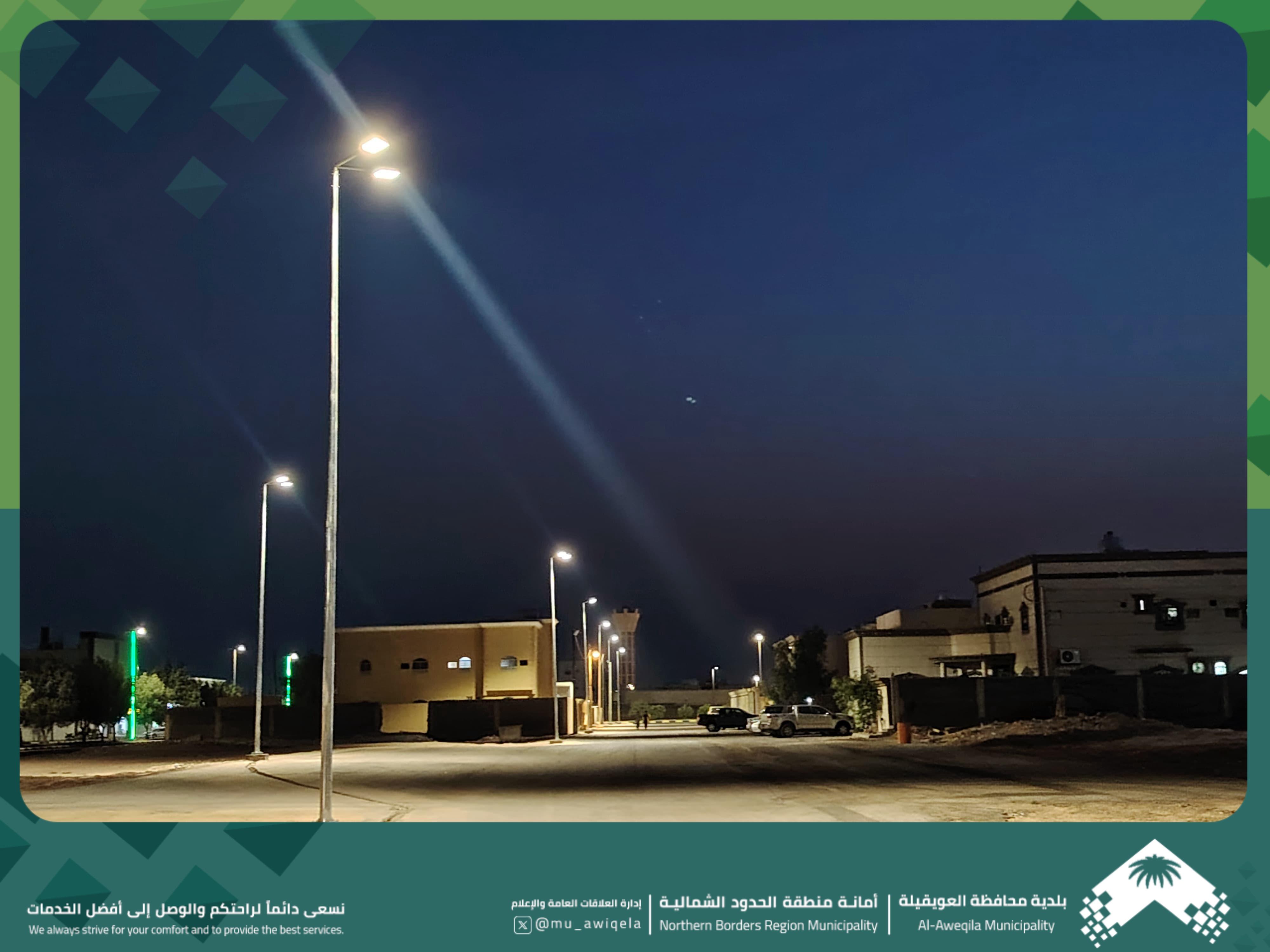 ضمن جهودها المستمرة لتحسين المشهد الحضري ورفع مستوى السلامة المرورية، بلدية محافظة العويقيلة تركب عدد من أعمدة الإنارة حديثاً بحي النسيم وتجعله من الأحياء المكتمل الخدمات كما شملت أعمالها معالجة اسفلتية لعدد من الحفريات والطرنشات التي تم حفرها حديثاً لإيصال التيار الكهربائي للأعمدة إنارة الشوارع داخل حيي النسيم والمنار.