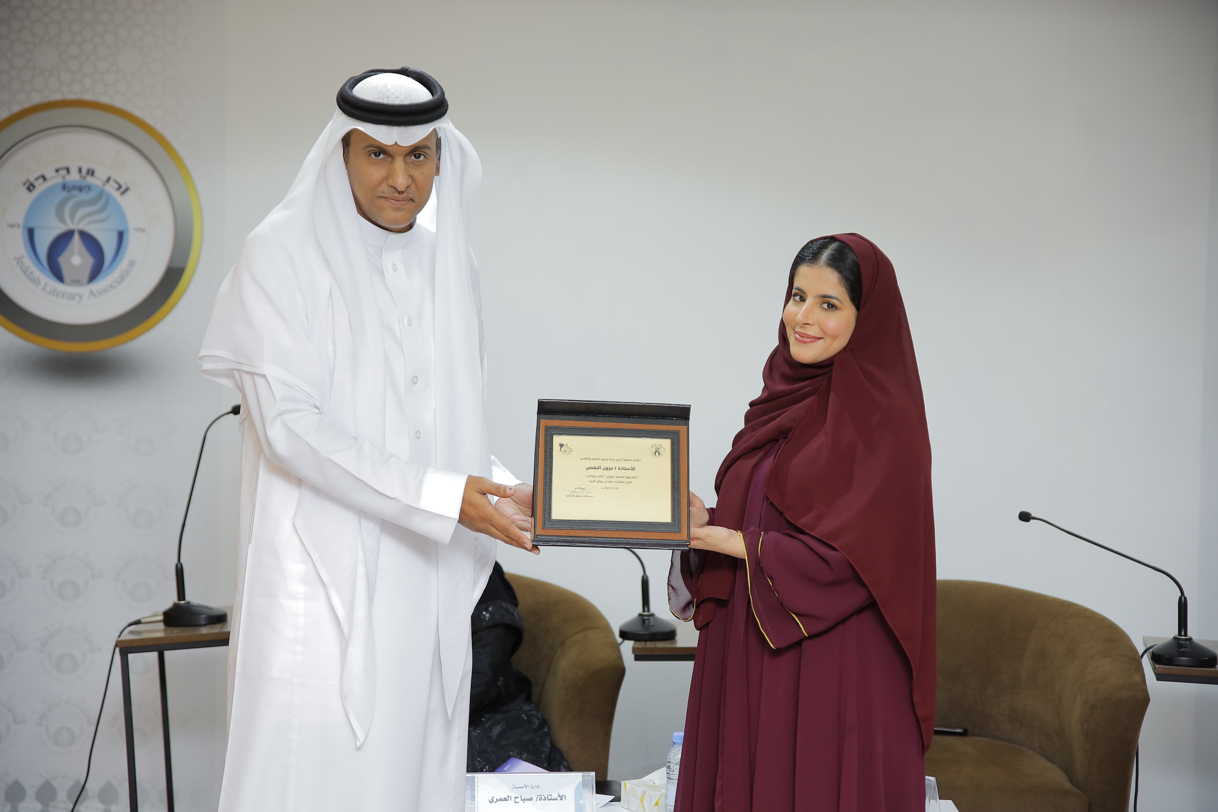 وفي ختام الأمسية السردية التي تأتي ضمن أجندة رواق السرد الثرية لهذا العام، كرّم رئيس رواق السرد الدكتور سلطان العيسي الضيفة ومديرة الحوار، كما امتد التكريم ليشمل فريق أثر التطوعي تقديراً لإسهاماتهم التنظيمية، ليكون اللقاء بذلك تجسيدًا لدور الرواق في تعزيز الحراك الأدبي وفتح نوافذ الحوار بين المبدع والمتلقي في فضاءات السرد المعاصر.