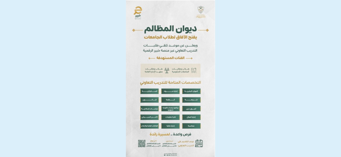 أعلن ديوان المظالم ممثلًا في الإدارة العامة للموارد البشرية عن فتح التقديم على التدريب التعاوني للفصل الدراسي الثاني لطلاب وطالبات الجامعات والمعاهد السعودية عبر منصة خبير الرقمية، وذكرت الإدارة أن فترة التقديم ستكون من 4 يناير 2026م إلى 11 يناير 2026م، على أن تبدأ فترة التدريب في 20 يناير 2026م، وتتيح المنصة فرصة التدريب في محاكم ديوان المظالم وإداراته والمرافق التابعة له.