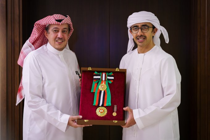وأعرب سمو الشيخ عبدالله بن زايد آل نهيان وزير الخارجية بدولة الإمارات، خلال استقباله للسفير الدخيل وتقليده الوسام، في أبوظبي، اليوم، عن تمنياته له بالتوفيق والنجاح، مثمناً دوره في تعزيز العلاقات الأخوية الراسخة والمتجذرة بين دولة الإمارات والمملكة العربية السعودية في المجالات كافة.