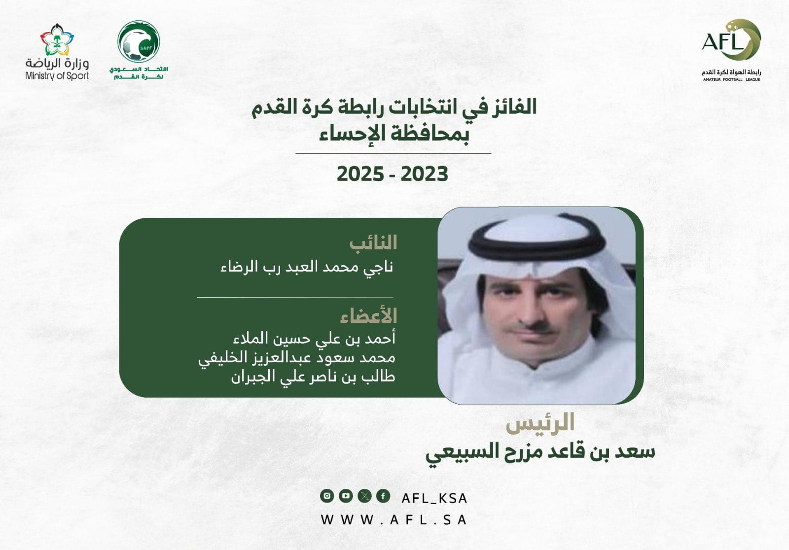 أعلنت رابطة الهواة – التابعة للاتحاد السعودي لكرة القدم- عن فوز الأستاذ «سعد بن قاعد بن مزرح السبيعي» برئاسة رابطة الهواة لكرة القدم بالأحساء.