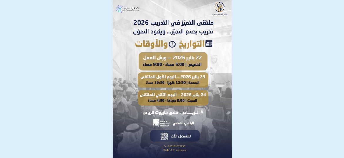 تنطلق بعد حوالي اسبوعين من الآن وبالتحديد في 22 من شهر يناير الجاري فعاليات النسخة الثانية من ملتقى التميز في التدريب الذي تنظمه مؤسسة الآفاق المعرفية لتنظيم المعارض والمؤتمرات، بمشاركة 70 متحدثًا خليجيًا وعربيًا، وذلك بفندق ماريوت الرياض على مدى ثلاثة أيام ، 22 - 24 يناير 2026 .