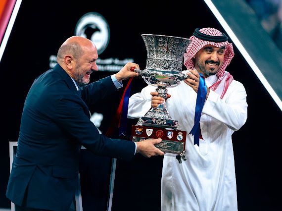 توَّج صاحب السمو الملكي الأمير عبدالعزيز بن تركي الفيصل؛ وزير الرياضة، رئيس اللجنة الأولمبية والبارالمبية السعودية، فريق برشلونة بكأس السوبر الإسباني لعام 2026، عقب فوزه على ريال مدريد بنتيجة (3-2)، في المباراة النهائية التي أُقيمت على ملعب الإنماء بمدينة الملك عبدالله الرياضية في جدة، وذلك بحضور رافائيل لوزان أبال رئيس الاتحاد الإسباني لكرة القدم، وعدد من قيادات الوزارة والاتحاد الإسباني، ومسؤولين رياضيين في القطاع الرياضي، وسط حضور جماهيري كبير جداً بلغ 60326 متفرجًا.