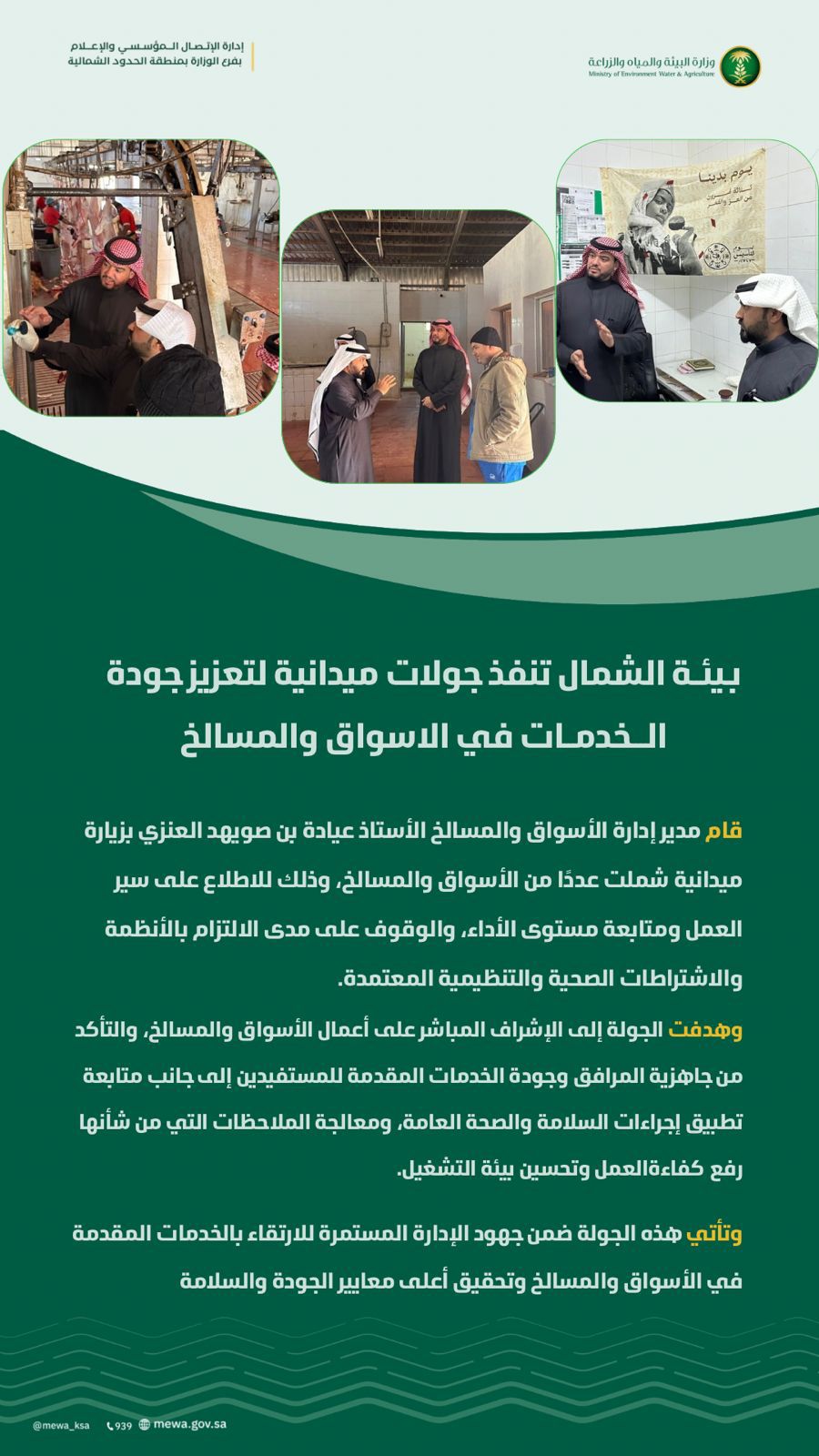 قام مدير إدارة الأسواق والمسالخ الأستاذ عيادة بن صويهد العنزي بزيارة ميدانية شملت عددًا من الأسواق والمسالخ، وذلك للاطلاع على سير العمل ومتابعة مستوى الأداء، والوقوف على مدى الالتزام بالأنظمة والاشتراطات الصحية والتنظيمية المعتمدة.