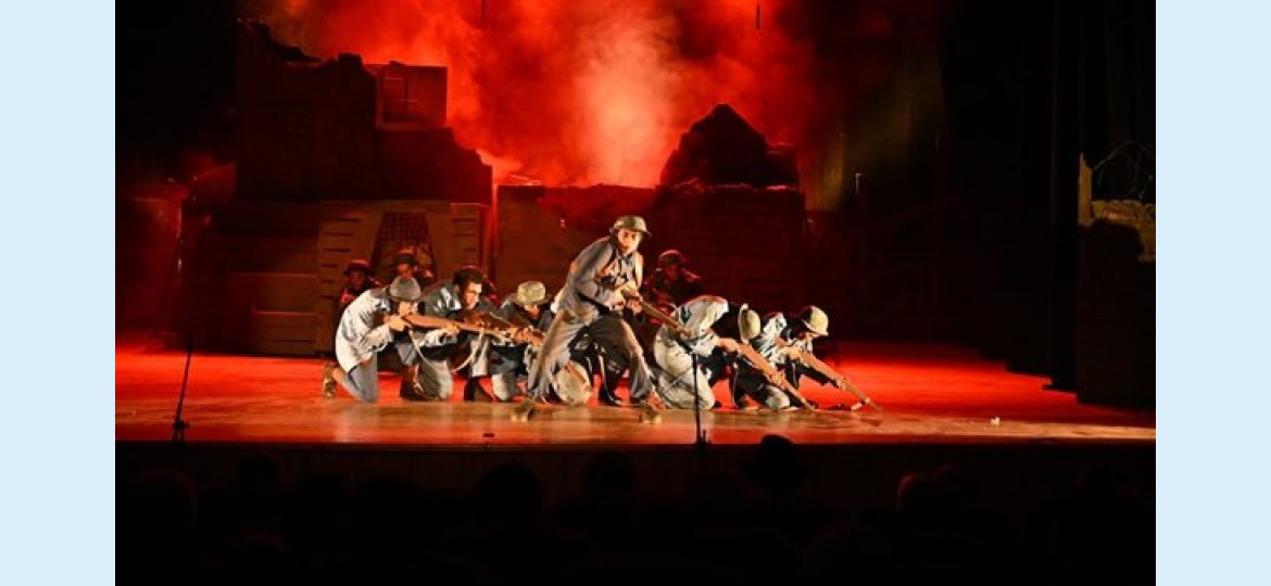 لقد حول المخرج الفضاء المسرحي إلي مجرد بقايا وأطلال، عبارة عن أربع بانوهات تمثل بقايا مباني تتحرك بشكل دائري، تتضافر وتتفكك مرة أخري، قطعة ديكور واحدة انقسمت إلي وحدتين متصارعتين، وموسيقي عسكرية تدعو للتأهب والاستعداد، فتظهر الصورة المسرحية كأنها فيديو أو صورة متحركة، ليؤكد علي فكرة أن في الأصل الشعوب واحدة، والأرض واحدة، فهذا الانقسام وهمي، اخترعته الحكومات لتخدع به الشعوب، فأصبحوا يتصارعون، وهذا ما اتضح عبر الإيماءة الجسدية للممثلين التي ظهرت في حالة من التوتر والتأهب، فمنذ اللحظة الأولي كانت الإضاءة تحمل دلالات جمالية بفضل مصمم الإضاءة عز حلمي، حيث سيطر علي الفضاء المسرحي إضاءة حمراء دموية كدلالة علي القتال، وأحيانًا تكون إضاءة زرقاء شاحبة كعلامة علي الموت، والأجمل أنه جعل الصورة المسرحية أشبه بصورة رمادية، وذلك استنادًا علي لون ملابسهم الشاحبة وتسليط عليهم سبوت إضاءة دائري، فجعل الجنود يتجلّوا كأنهم جثث تتحرك، كما تسيطر إضاءة صفراء شاحبة علي المشهد المسرحي، لتُشير إلي حالة الحزن التي طالت المشاعر بسبب أجواء الحرب.
