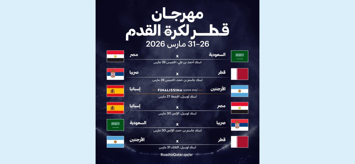 الدوحة، دولة قطر ـــ أعلنت اللجنة المحلية المنظمة لأحداث كرة القدم عن مهرجان قطر لكرة القدم 2026 الذي سيعقد خلال الفترة من 26 إلى 31 مارس. وسيضم المهرجان مباراة كأس فيناليسيما 2026، إلى جانب عدد من المباريات الدولية التي تجمع نخبة من المنتخبات استعدادًا لمشاركتها في بطولة كأس العالم 2026™️، بما يتيح لها الوقوف على جاهزيتها الفنية والتنافسية قبل انطلاق الحدث العالمي المرتقب.