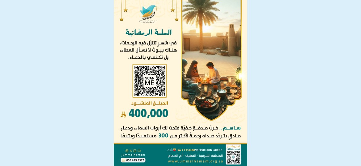 أطلقت جمعيّة أمّ الحمام الخيريّة للخدمات الإنسانيّة برنامج «السلّة الرمضانية» لعام 1447هـ بميزانيّة إجماليّة تبلغ (400,000) أربعمائة ألف ريال، وذلك ضمن جهودها المتواصلة لدعم الأسر المحتاجة والتخفيف من الأعباء المعيشيّة عنهم خلال الشهر الفضيل.