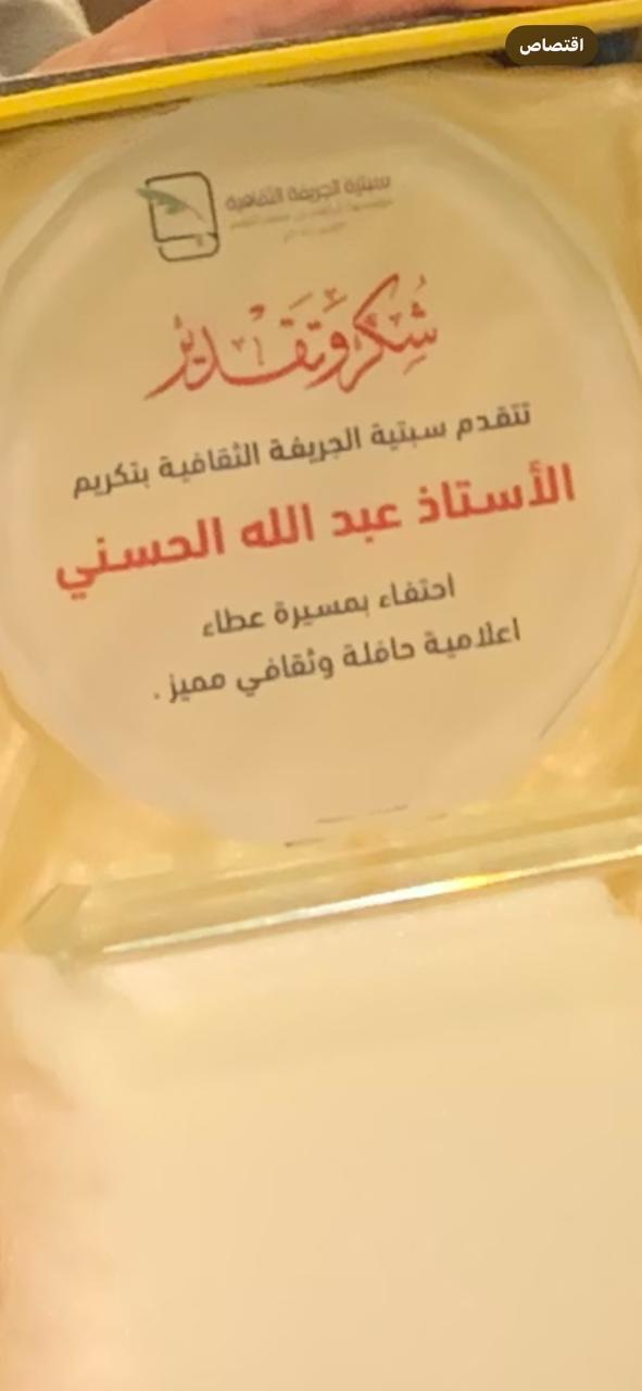 كما تسلّم عبدالله الحسني درعًا تذكاريًا تكريميًا من سبتيّة الجريفة، تقديرًا لمسيرته الإعلامية والثقافية واسهاماته في المشهد الثقافي.