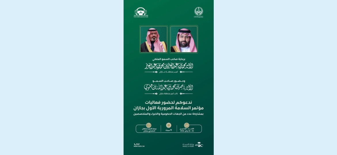 برعاية كريمة من صاحب السمو الملكي الأمير محمد بن عبدالعزيز بن محمد بن عبدالعزيز آل سعود - أمير منطقة جازان - وبحضور صاحب السمو الأمير ناصر بن محمد بن جلوي - نائب امير منطقة جازان - ينظم فرع وزارة الصحة بجازان مؤتمر ومعرض السلامة المرورية الأول بجازان تحت شعار سلامة تُدار.. وأرواح تُحمى " غداً الاحد والاثنين 25 إلى 26 يناير 2026م، في مركز الأمير سلطان الحضاري.