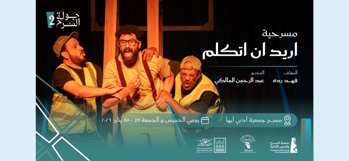 تواصل جمعية المسرح والفنون الأدائية تنظيم عروض جولة المسرح المحلي الثانية، حيث تستعد مدينة أبها لاستضافة العرض المسرحي أريد أن أتكلم لفرقة مسرح الطائف، الحائز على جائزة أفضل عرض متكامل في مهرجان الهواة.