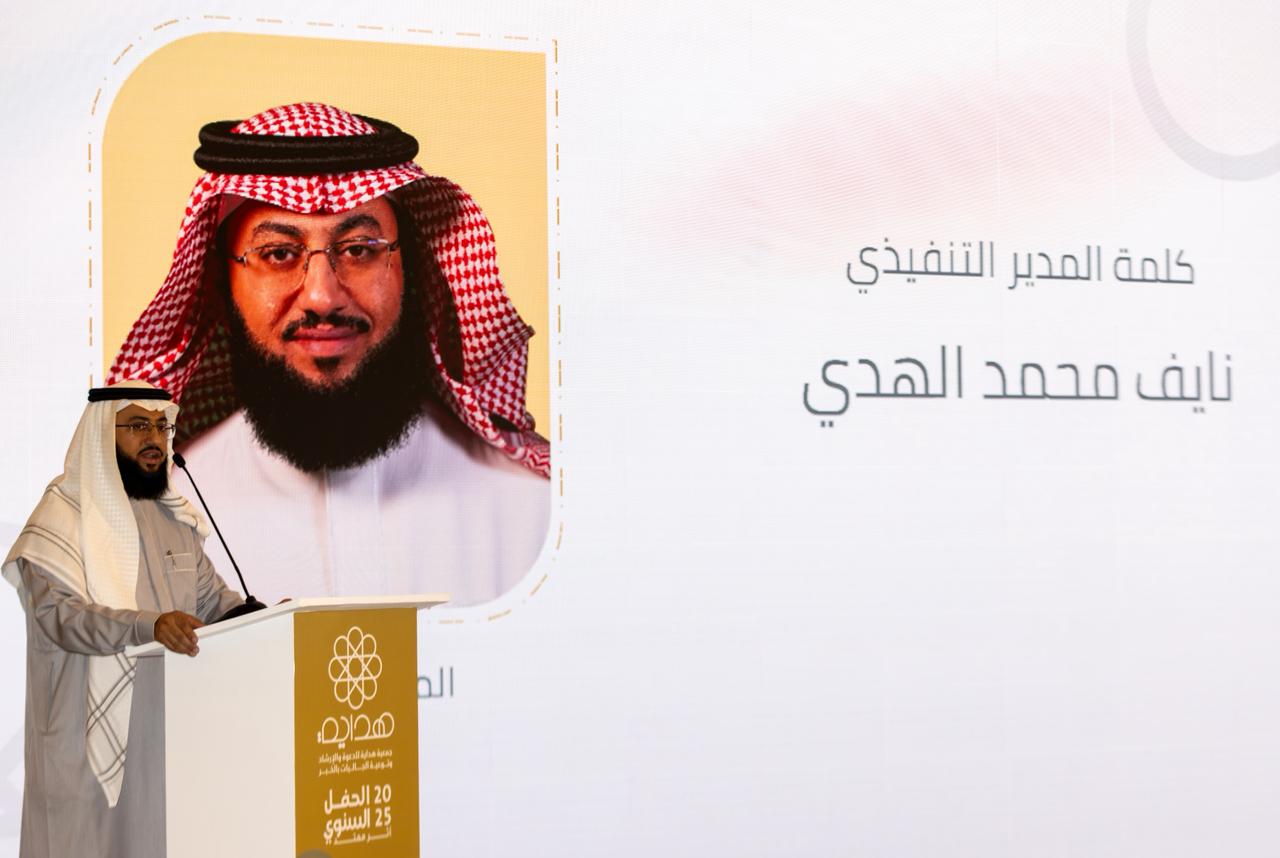 ثم ألقى المدير التنفيذي لجمعية هداية الأستاذ نايف الهدي كلمة استعرض خلالها حصاد منجزات الجمعية مؤكدًا أن الجمعية عملت خلال العام وفق رؤية استراتيجية تهدف إلى تعظيم الأثر الدعوي وتوسيع نطاق المبادرات والبرامج المجتمعية.
