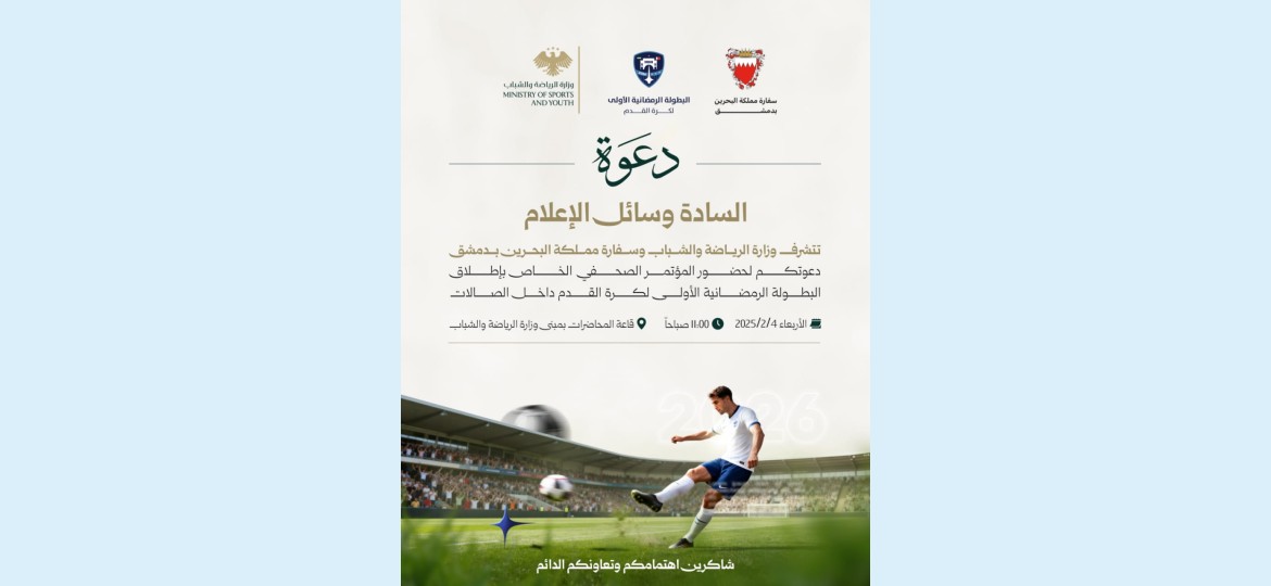 تحت رعاية وتنظيم مشترك بين وزارة الرياضة والشباب وسفارة مملكة البحرين في دمشق، وبالتعاون مع اتحاد كرة القدم، يُعقد عند الساعة الحادية عشرة من صباح يوم الأربعاء 4 شباط 2026 المؤتمر الصحفي الرسمي لإطلاق البطولة الرمضانية الأولى لكرة القدم داخل الصالات في قاعة المحاضرات بمبنى وزارة الرياضة والشباب، حيث سيتم الكشف عن تفاصيل البطولة وأهدافها الرياضية والمجتمعية، إلى جانب استعراض آلية التنظيم ونظام المنافسات.