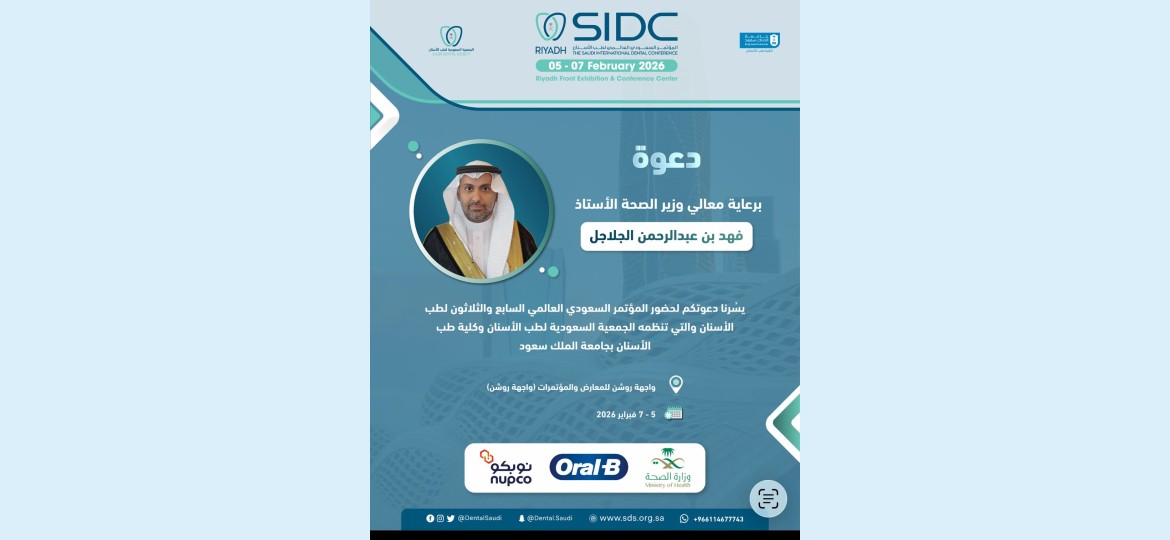 تحت رعاية معالي  وزير الصحة  الأستاذ فهد بن عبدالرحمن الجلاجل، تنظم  الجمعية السعودية لطب الأسنان بالتعاون مع كلية طب الأسنان بجامعة الملك سعود المؤتمر الدولي السنوي في نسخته السابعة والثلاثين، وذلك خلال الفترة من 5 إلى 7 فبراير 2026م في واجهة روشن للمعارض والمؤتمرات بمدينة الرياض، بمشاركة واسعة من الخبراء والمتخصصين والشركات الرائدة في قطاع طب الأسنان من داخل المملكة وخارجها.