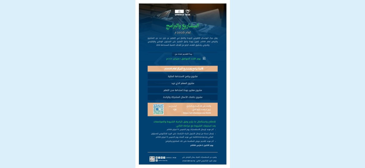يعلن مركز اليونسكو الإقليمي للجودة والتميز في التعليم عن طرح حزمة من المشاريع والبرامج النوعية لعام 2026، وذلك في إطار جهوده المستمرة لتعزيز جودة وتميّز التعليم على المستويات الوطني والإقليمي والدولي، ودعم تحقيق الهدف الرابع من أهداف التنمية المستدامة المتعلق بالتعليم الجيد المنصف والشامل للجميع.