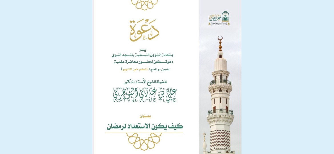 واصلت وكالة الشؤون النسائية في المسجد النبوي تنفيذ خطتها التشغيلية، من خلال تفعيل وتنظيم المحاضرات العلمية الموجهة لقاصدات المسجد، حيث أُقيمت محاضرة بعنوان «كيف يكون الاستعداد لرمضان» قدّمها فضيلة الشيخ الأستاذ الدكتور علي بن غازي التويجري، المدرّس بالمسجد النبوي، وذلك ضمن برنامج «أتاكم خير الشهور».