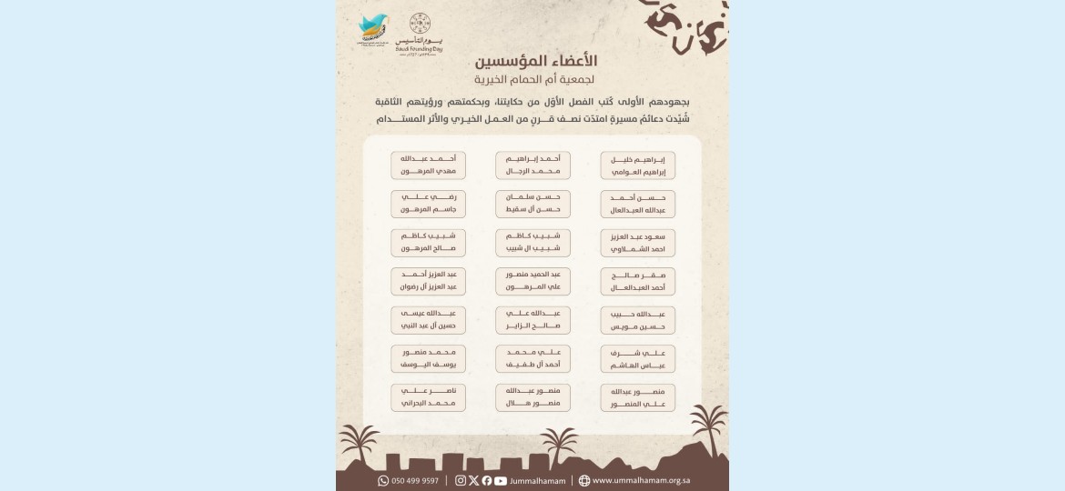 استذكرت جمعيّة أمّ الحمام الخيريّة مؤسّسيها الأوائل في العام 1974م، والبالغ عددهم (21) عضوًا، وذلك تزامنًا مع مناسبة يوم التّأسيس للعام 2026م، وذلك تأكيدًا على الاعتزاز بالبدايات الرّاسخة واستحضارًا لجهود الرّجال الّذين كتبوا الفصل الأوّل من مسيرة الجمعيّة الممتدّة في العمل الخيريّ وخدمة المجتمع.