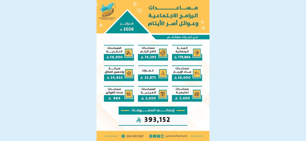 أعلنت جمعيّة أمّ الحمام الخيريّة أنّ إجمالي مصروفات البرامج الاجتماعيّة وعوائل أسر الأيتام خلال شهر فبراير 2026م بلغ (393,152) ريالًا، ثلاثمئة وثلاثة وتسعين ألفًا ومئة واثنين وخمسين ريالًا، وذلك ضمن جهودها المستمرة لدعم الأسر المستفيدة وتعزيز استقرارها المعيشيّ.
