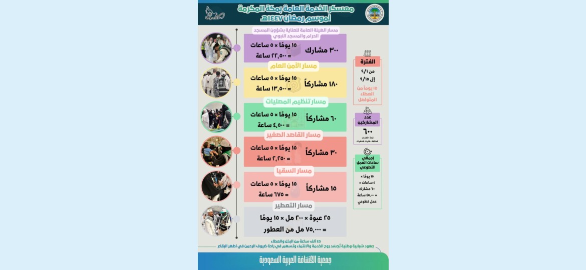 كما شارك 60 كشافاً في مسار تنظيم المصليات داخل المسجد الحرام وساحاته مسجلين 4,500 ساعة تطوعية، إلى جانب 30 كشافاً في مبادرة القاصد الصغير المعنية بالعناية بأطفال المعتمرين أثناء أداء ذويهم للنسك بإجمالي 2,250 ساعة تطوعية.