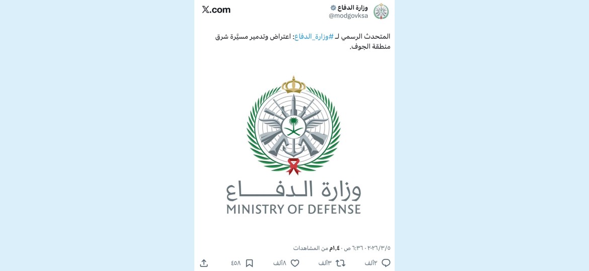 إن تدمير تلك المسيّرة في فضاء الجوف هو رسالة ردع صامتة لكل من تسول له نفسه اختبار الصبر السعودي ، وهي تأكيد على أن سماءنا ليست للمغامرات ، وأن أرضنا ليست للمزايدات فبينما ينشغل العالم بالصراعات ، تنشغل قيادتنا بتمكين الإنسان وحماية الأوطان والمقدسات ، موفرةً بيئة من الأمان المطلق التي جعلت من المملكة واحة استقرار في محيطٍ متلاطم .