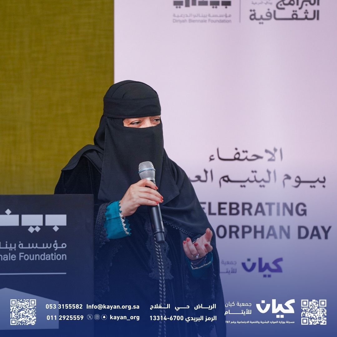 ثم بينت الأستاذة (ندى القنبيط) المدير التنفيذي بجمعية كيان في كلمتها أن الجمعية تحتفل بيوم اليتيم العربي هذا العام في أجواء مختلفة وملهمة، وذلك في ساحات معرض «في الحلّ والترحال» الذي تستضيفه مؤسسة بينالي الدرعية، حيث يقدم المعرض رؤية فنية ترى العالم مساحة دائمة التحول والتطور.