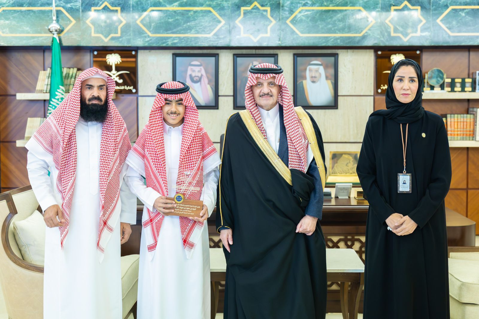 استقبل صاحب السمو الملكي  الأمير سعود بن نايف بن عبدالعزيز  أمير المنطقة الشرقية، في مكتب سموه بديوان الإمارة اليوم الثلاثاء، الطالب تميم بن سعود العنزي والطالبة بيان بنت عبدالله باعقيل الفائزين في المسابقة المحلية على جائزة خادم الحرمين الشريفين الملك سلمان بن عبدالعزيز لحفظ القرآن الكريم وتلاوته وتفسيره في دورتها الـ27، حيث كرّم سموه الفائزين تقديراً لتميّزهما في حفظ كتاب الله الكريم، بحضور مدير عام التعليم بالمنطقة الشرقية الدكتورة منيرة بنت بدر المهاشير.