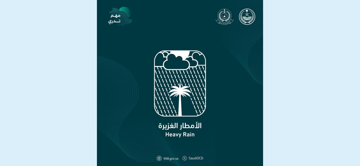 وأكدت المديرية أهمية الابتعاد عن المناطق المنخفضة وتجمعات المياه وبطون الأودية خلال هطول الأمطار، وعدم المجازفة باجتياز الأودية أثناء جريان السيول، وأخذ الحيطة والحذر عند التنقل أو ممارسة الأنشطة الخارجية، واتباع إرشادات وتعليمات السلامة المعلنة عبر وسائل الإعلام الرسمية ومواقع التواصل الاجتماعي، والاتصال بالرقمين (911) في مناطق مكة المكرمة والمدينة المنورة والرياض والشرقية، و(998) في بقية مناطق المملكة لطلب المساعدة في الحالات الطارئة.