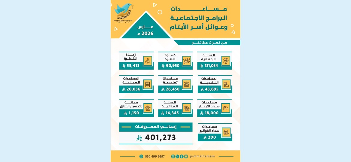 واصلت جمعيّة أمّ الحمام الخيريّة جهودها الإنسانيّة خلال شهر مارس 2026م، حيث قدّمت باقة من المساعدات المتنوّعة لدعم الأسر المستفيدة وعوائل الأيتام، في إطار حرصها على تعزيز التكافل الاجتماعيّ وتحقيق الاستقرار المعيشيّ للفئات الأشدّ حاجة، وقد بلغ إجماليّ ما تمّ صرفه خلال الشهر (401,272) ريالًا.