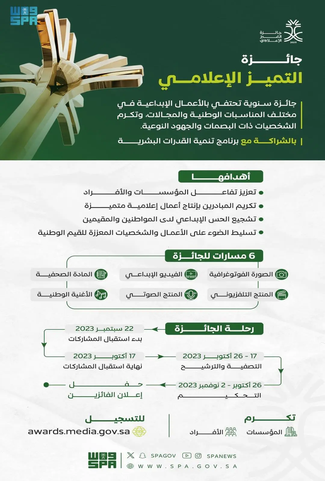 أطلقت وزارة الإعلام جائزة التميُّز الإعلامي 2023 في نسختها الرابعة، والتي تحتفي بجميع الأعمال الإعلامية الإبداعية المتميّزة خلال عام كامل، بالشراكة مع برنامج تنمية القدرات البشرية، كما تُكرِّم الشخصيات ذات البصمة البارزة إعلاميًا، وذات الجهود النوعية المشهودة في مجالات الإعلام, حيث يبدأ استقبال المشاركات من جميع المؤسسات والأفراد خلال الفترة من 22 سبتمبر حتى 17 أكتوبر2023م.