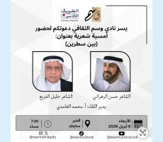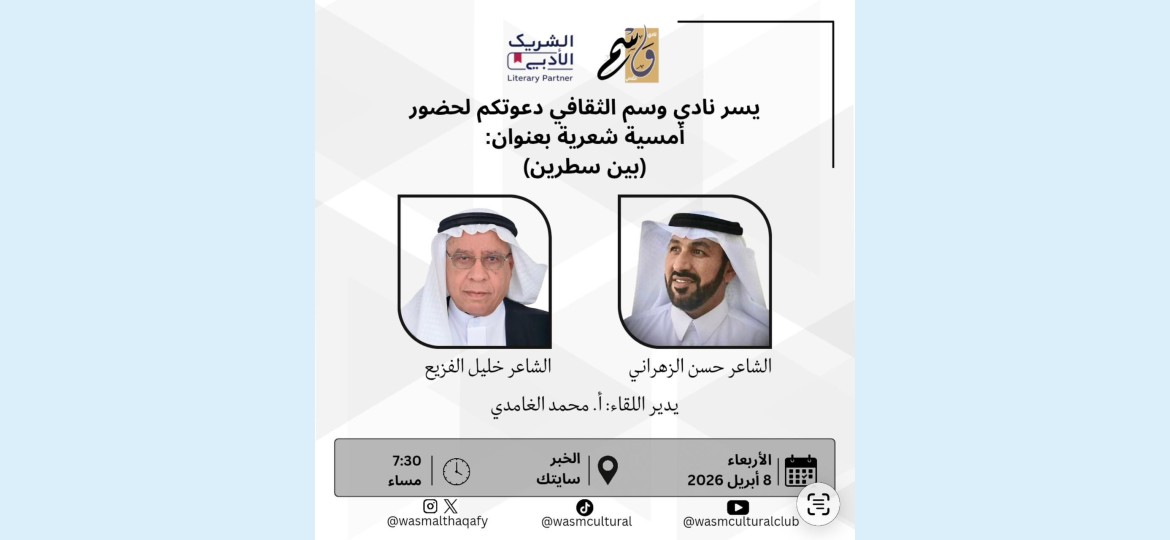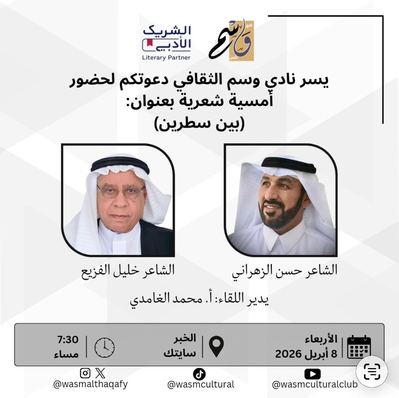 ضمن اهتمام نادي وسم الثقافي باللقاءات الأدبية التي تمنح القصيدة مساحة جديدة للحضور وتفتح بابا للإنصات إلى الشعر بوصفه لغة تقترب من الوجدان، يستعد النادي لتنظيم أمسية شعرية بعنوان بين سطرين، تجمع تجربتين شعريتين لكل منهما صوته المميز، وذلك مساء الأربعاء 8 أبريل 2026 في مدينة الخبر.
