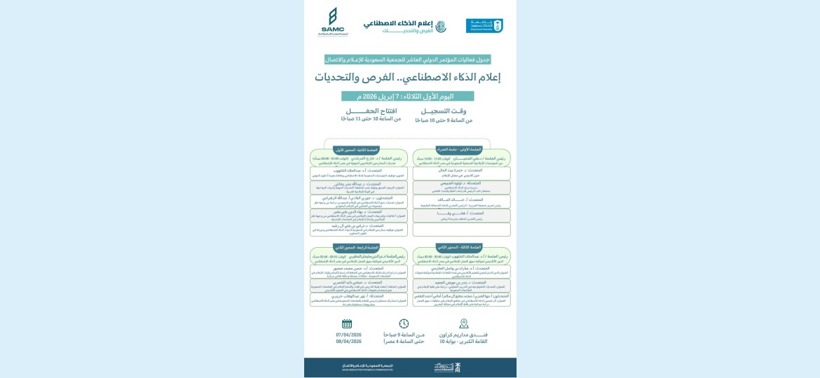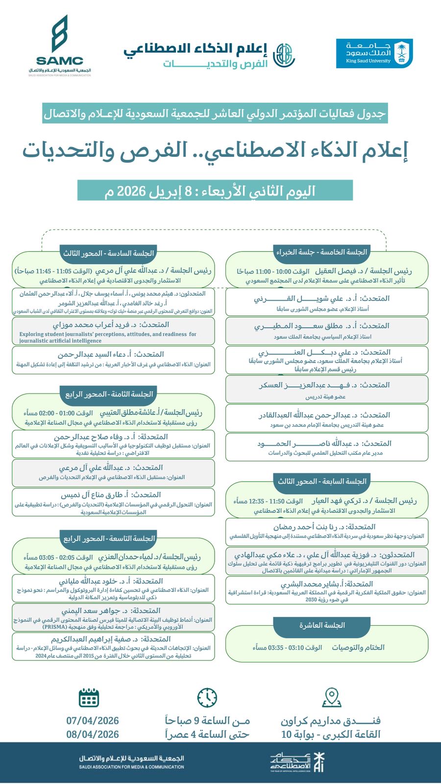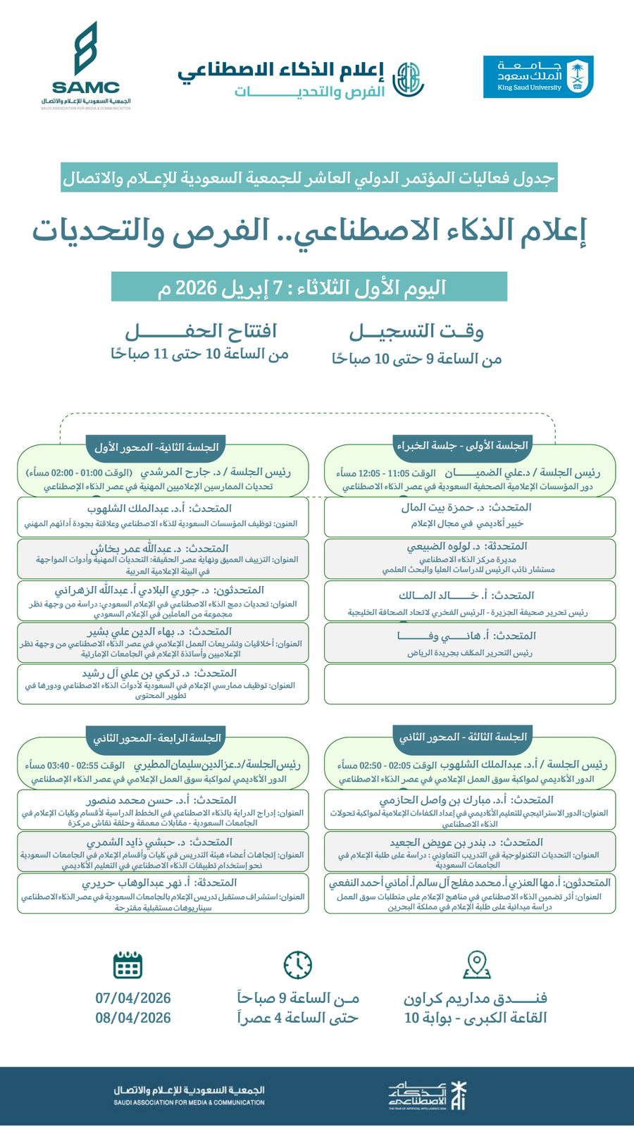 تنطلق اليوم الثلاثاء ٧ ابريل ٢٠٢٦ م فعاليات المؤتمر الدولي العاشر للجمعية السعودية للإعلام والاتصال بعنوان "إعلام الذكاء الاصطناعي.. الفرص والتحديات" في القاعة الكبرى بفندق مداريم كراون بوابة ١٠ شرق الرياض، وذلك برعاية رئيس جامعة الملك سعود المكلف الأستاذ الدكتور علي بن محمد مسملي.
