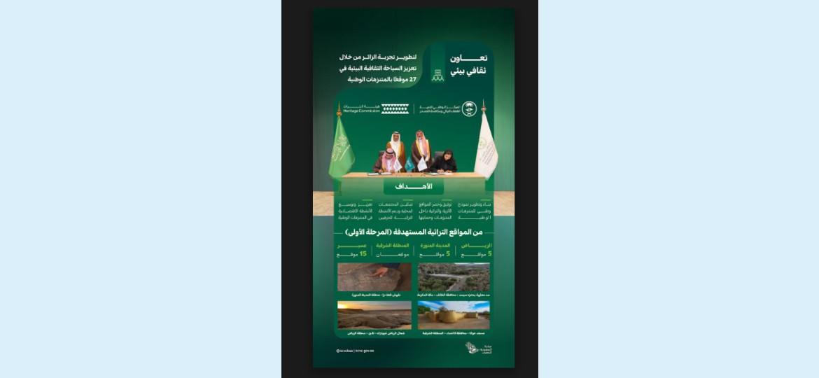 وقّع المركز الوطني لتنمية الغطاء النباتي ومكافحة التصحر، وهيئة التراث مذكرة تعاون، للعمل على ربط الأصول التراثية بالمتنزهات الوطنية، وتحويلها إلى وجهات ثقافية بيئية مستدامة، بما يُسهم في تعزيز السياحة، البيئية الثقافية، ودعم التنمية الاقتصادية، بالإضافة إلى حماية مواقع الآثار والتراث بمختلف مكوناته المادية وغير المادية التي تزخر بها مناطق المملكة، وذلك في 27 موقعًا بالمتنزهات الوطنية خلال المرحلة الأولى في العديد من مناطق المملكة، وإعادة تأهيلها وتحقيق استدامتها، وفقًا لمستهدفات رؤية السعودية 2030.