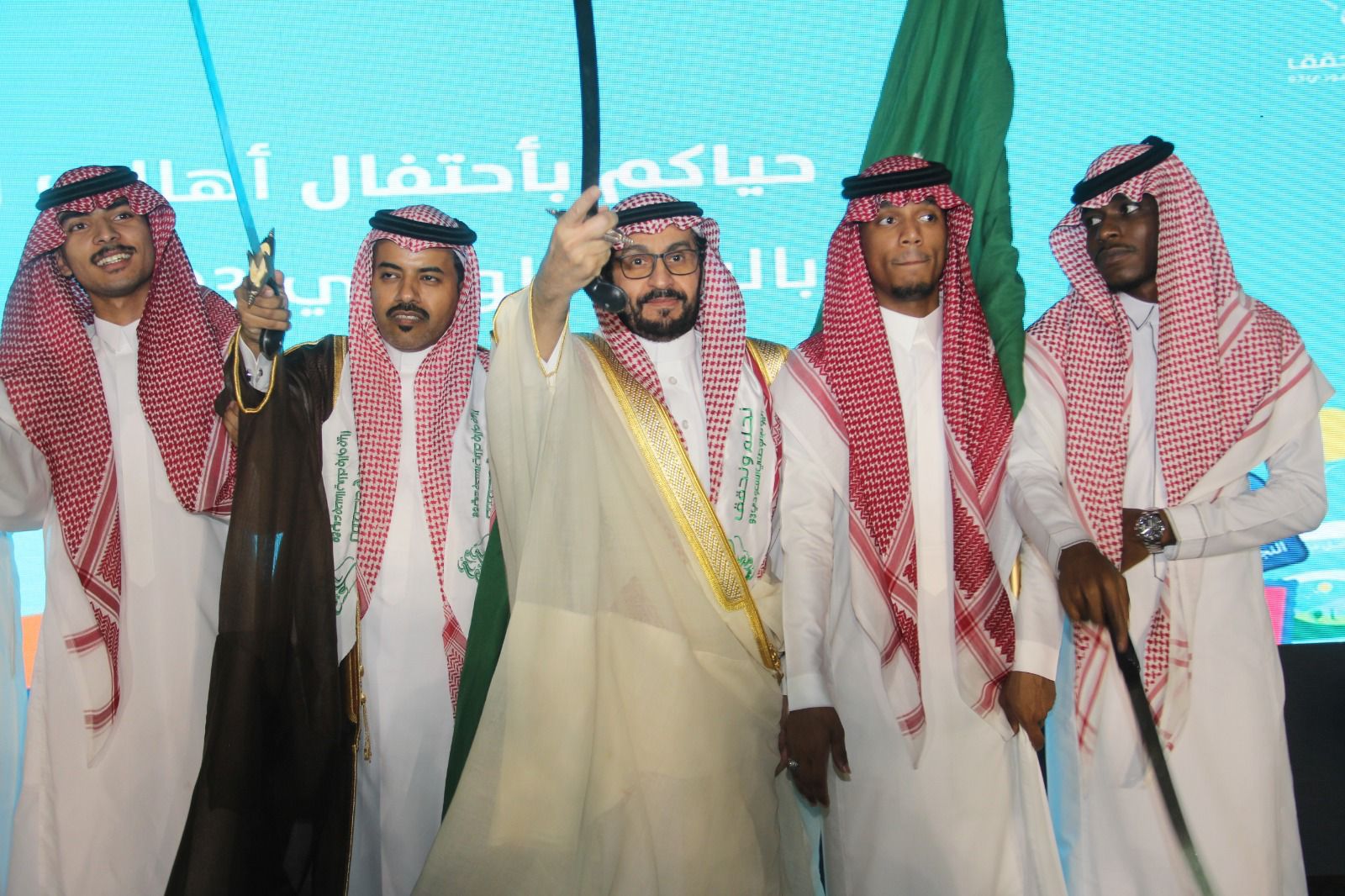 وكان في استقباله رئيس بلدية الناصفة المهندس جمال البلوي ورئيس مركز الناصفة مقرن الدوسري ورئيس مركز الرديفة وجماجم احمد الخلف ومدراء وروساء الدوائر الحكومية بالناصفة وقام سعادته بجولة على الفعاليات حيث بدأ الحفل الخطابي بالسلام الملكي ثم كلمة الاهالي بهذه المناسبة الغالية على قلوب الجميع ثم قصائد وطنية وكذلك عدة فقرات احتفاليه وفي الختام شارك سعادة المحافظ مدراء الجهات الحكومية والاهالي بالناصفة بالعرضة السعودية،