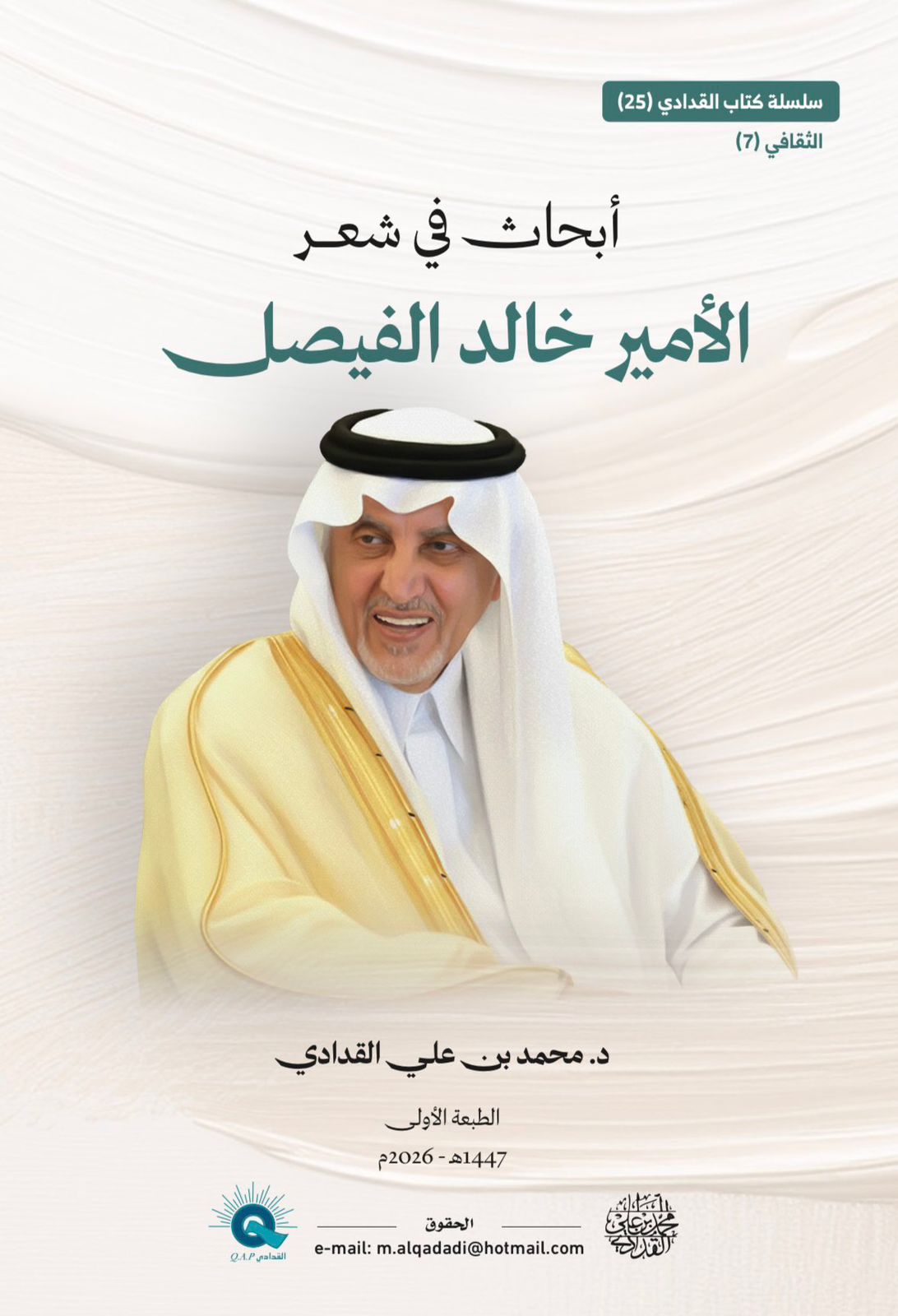 صدر حديثًا للدكتور محمد علي القدادي كتابه الجديد بعنوان «أبحاث في شعر الأمير خالد الفيصل»، في إصدارٍ يضاف إلى منجزه الثقافي، ويُعد العمل الخامس والعشرين ضمن سلسلة «كتاب القدادي»، والسابع في إطار إصداراته الثقافية المتخصصة.