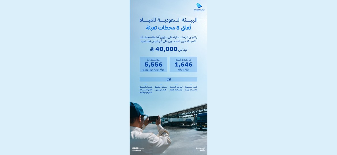أعلنت الهيئة السعودية للمياه تكثيف جولاتها الرقابية على أنشطة خدمات المياه اللاشبكية (ناقلات المياه ومحطات التعبئة)، وذلك عقب انتهاء المهلة الإلزامية الممنوحة لملاك ومشغلي محطات تعبئة المياه بتاريخ 31 مارس 2026 لتصحيح أوضاعهم والحصول على التراخيص النظامية.