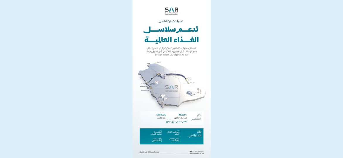 بتكامل لوجستي بين الخطوط الحديدية السعودية “سار” والهيئة العامة للموانئ "موانئ" و الشركة الوطنية السعودية للنقل البحري "البحري" ، تفعيل خدمة لوجستية لنقل منتج فوسفات ثنائي الأمونيوم (DAP) من رأس الخير إلى ميناء ينبع، مرورًا بساحة الشحن في حائل، في خطوة تعزز سلاسل الغذاء العالمية وتدفق السلع الحيوية إلى الأسواق الدولية، ضمن منظومة لوجستية متكاملة تربط بين أنماط النقل المختلفة (السككي – البري – البحري).