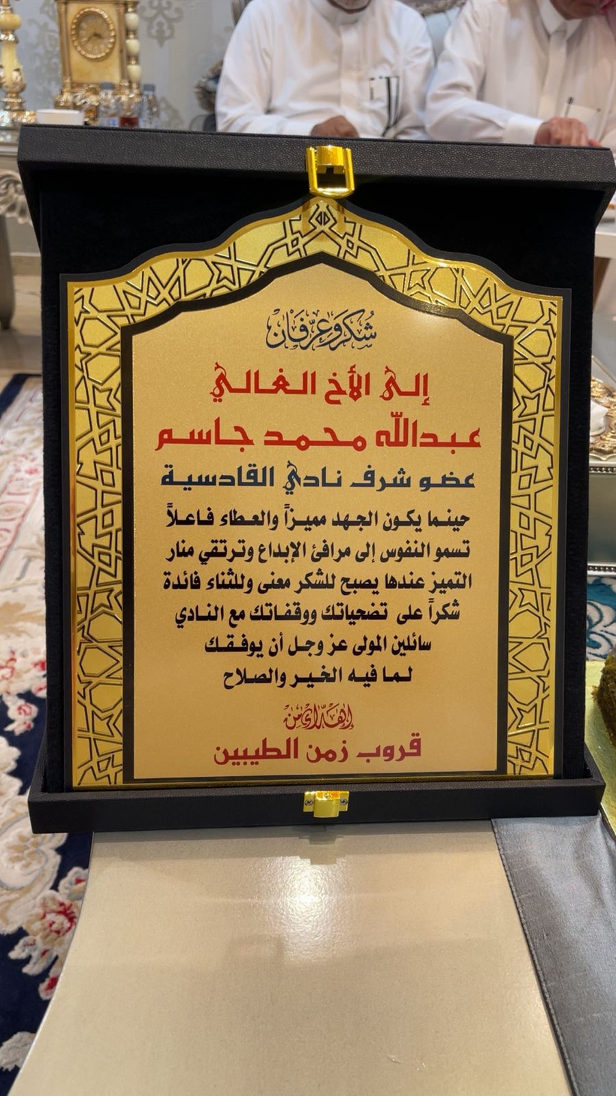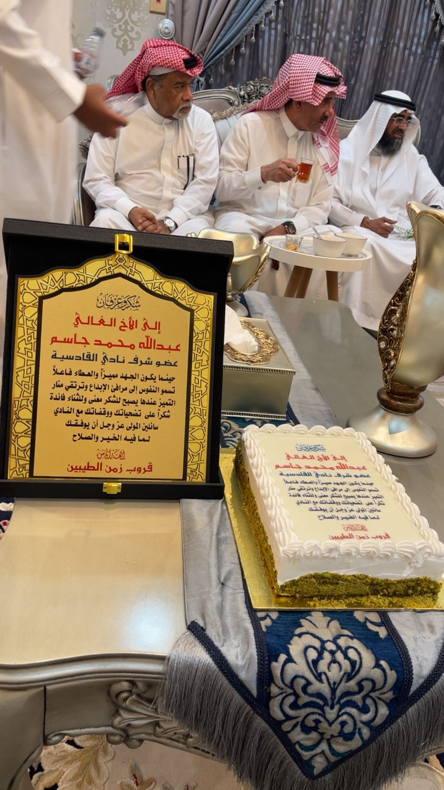 وتقديراً لما قدمه من جهود وخدمات جليلة لرياضة الوطن ولنادي القادسية، قدّم أعضاء الملتقى درعاً تذكارياً للكابتن عبدالله جاسم، عرفاناً بعطائه ومسيرته الحافلة.