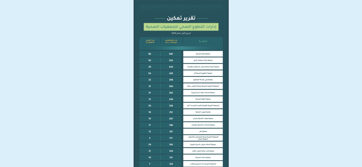 وقالت الجلعود: "إن تحقيق المركز الثاني في مجال التطوع الصحي يعكس عملاً مؤسسياً منظماً ورؤية واضحة وأثراً مجتمعياً ملموساً". مؤكدةً أن عطاء المتطوعين والمتطوعات كان له الأثر الكبير في خدمة المجتمع، سائلةً الله التوفيق لمواصلة التميز والإسهام في تحقيق مستهدفات رؤية المملكة 2030.