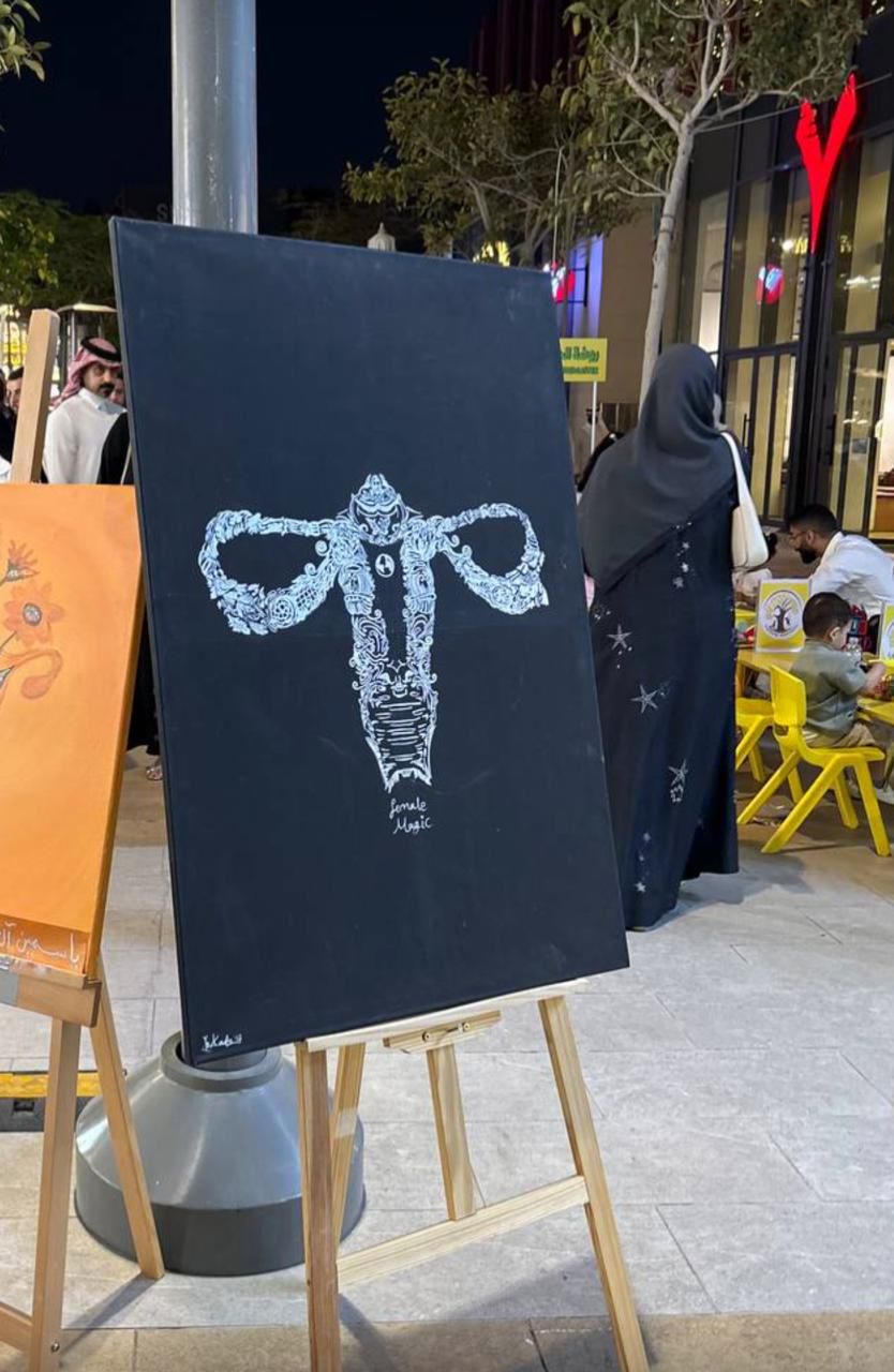 ولأن الفن هو اللغة الأكثر عمقاً حين يضيق التعبير، خطفت الدكتورة والفنانة التشكيلية كادي الثنيان الأنظار بعملها الفني المبتكر (Female Magic) الذي جسدت الجهاز الأنثوي ليس كعضو طبي فحسب، بل كأيقونة فنية تفيض بالرموز.